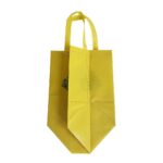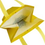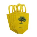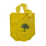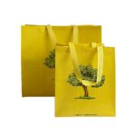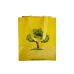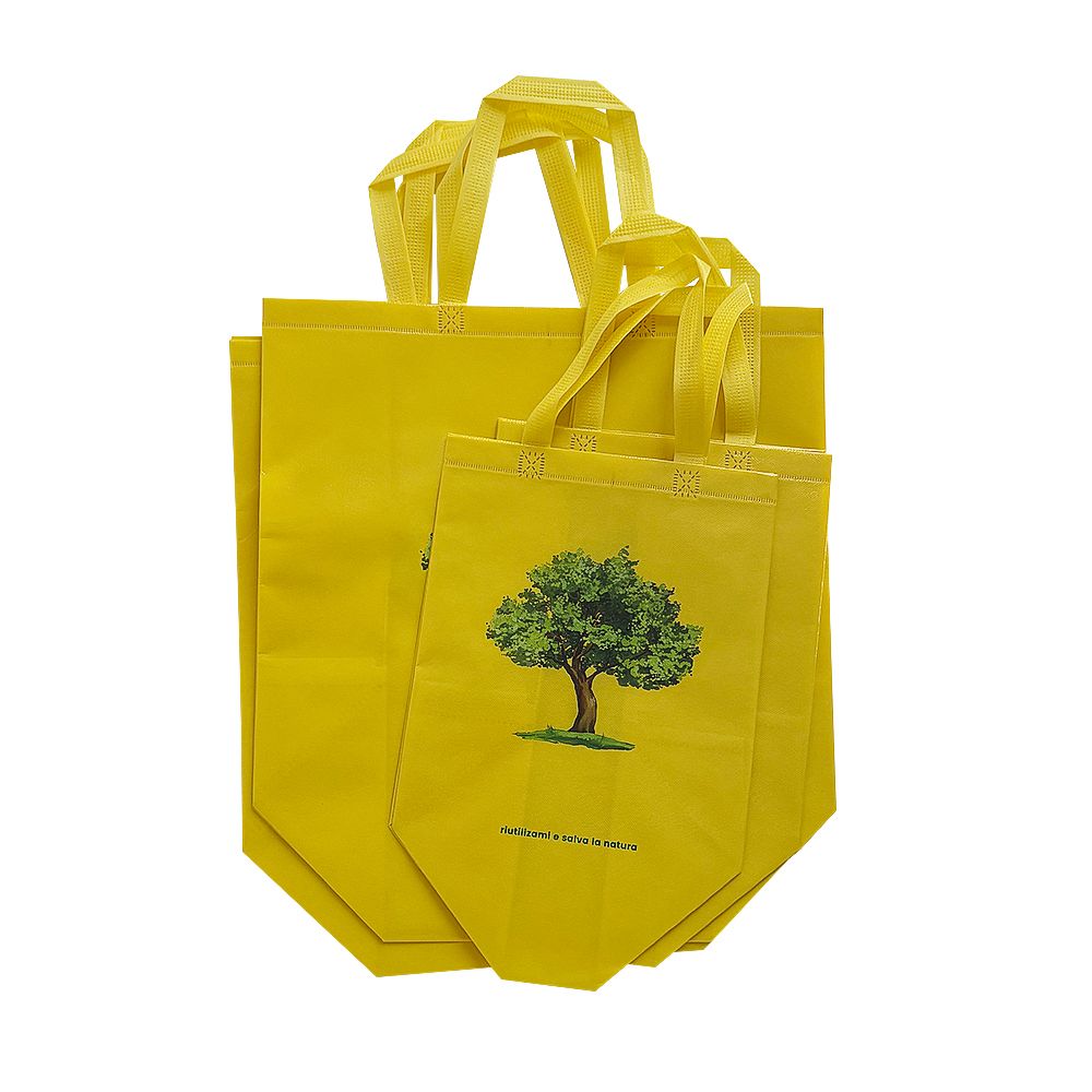 Shopper in TNT gialla con stampa logo albero. Resistente e riutilizzabile, ideale per negozi bio, mercati e fiere.